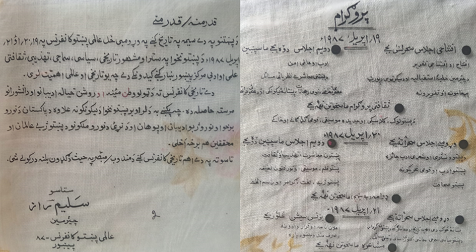 د وړومبي عالمي پښتو کانفرنس د پاره د اپرېل ۱۹ ، ۲۰ او ۲۱ نيټه وټاکلې شوه او د پېښور تحصيل ګورګټهرۍ يو شادي هال کښې د دې د انعقاد فېصله وشوه ـ مختلفې کميټۍ جوړې شوې چې کارونه ورته حواله شول ـ مشاورتي کمیټۍ کښې مير مهدي شاه مهدي ، رضا همداني ، سردار خان فنا ، مراد شينواري ، ايوب صابر ، شېر زمان غمژن ، لطيف وهمي او همېش خليل شامل وو ـ تاج محمد امر ، کرنل عنايت الله ، ډاکټر فضل دين خټک او مبارک احمد مبارک د فنانس کميټۍ غړي وو ـ په ثقافتي کميټۍ کښې مراد شينواري ، سعد الله جان برق ، سردار علي ټکر او ګلزار عالم شامل وو ـ لطيف افريدے ، غلام احمد بلور ، میاں شاهين شاه ، اکبر جي ، کرنل علي ګوهر او ګل رحمان د استقبالیه کميټۍ غړي وو ـ او داسې اکبر حيات کاکاخېل ، ذاکر خان ذاکر ، فریدون ، ارشد طوفان ، سرور خټک ، صاحب شاه صابر ، نورالبشر نويد ، بهرام ساحل ، قمر زمان قمر ، شهاب خټک ، وسیع الله ، محمد پروېز خان ، امين الله او کفایت الله ته مختلف امور حواله وو ـ په ۱۹ اپرېل ۱۹۸۷ د کانفرنس افتتاح د بابائے غزل امیر حمزه خان شينواري په لاس وشوه ـ او مشر مېلمه ئې فخر افغان خان عبدالغفار خان وۀ ـ خان عبدالغفار خان بابا د خپل ژوند اخري تقرير هم دې کانفرنس کښې کړے وۀ ـ کله چې باچاخان بابا د ګور ګټهرۍ کانفرنس هال ته راورسېدو نو تپوس ئې وکړو چې سلیم راز چرته دے چې د کانفرنس فنډ کښې خپله برخه ورکړم ـ د نېشنل ګوند يو غړي ورته ووئيل چې مونږ له ئې راکړئ ور به ئې کړو ـ خو باچا خان بابا ونۀ منله وئيل ئې چې کانفرنس هال ته به هله ورځم چې سلیم راز ته په خپل لاس پېسې ورکړم ـ تر دې چې سلیم راز خبر کړې شو او هغه په منډه منډه د باچا خان بابا خوا ته راغلو ـ او داسې باچا خان بابا کانفرنس هال ته ننوتو نه مخکښې درې زره روپۍ سلیم راز ته په خپل لاس ورکړې