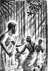 ” سترګې به دې وسوځي ! “ د نواے مور ايزنما ته د مينې په انداز کښې د يام سپينولو نه سر اوچت کړه او لږ په سخته ووئيل ” پکې ورته ووهه کنه ” هغه پاسیده او د چت د تير نه ئي ببوزې راکوز کړ . هم په دغه مهال يوه چيلۍ لګي شوه او د يام په پوستکو ئي خله کيښوده او د ځاے د ځاے نه ئي خوړلو باندې ئي شروع وکړه او د ځان سره ئي يوړه او د نورو چيلو په منځ کښې ودريده او شخوند ئي وهل شروع کړ . د نواے مور د چيلۍ په دې حرکت غصه شوه او بيا د يام سپينولو د پاره کيناسته . د ايزنما د اور نه اوس لوګے په بره روان شه . هغې ورته ببوزې وهلو عن تر دې چې شغلې ئي په بړکيدو شوې . د نواے مور د هغې شکريه ادا کړه او ايزنما د خپلې مور جونګړې ته پستنه شوه . هممهاله چرته د لرې نه د ډولونو غږ پورته شه . دا غږ د ايلو (د کلي پخوانے لوے مېدان ) نه راتله . د افريقې په هر کلي کښې همدغسې ايلو ؤ او د هر ايلو لرغونتوب د کلي د لرغونتوب برابر وه . دلته به کلي هر تقريب او د هر قسم ګډا ګانو انتظام کيده چې د ژوندون نه به ډکې وې او چرته به چې ژوندون ښه په جوین کښې شه .